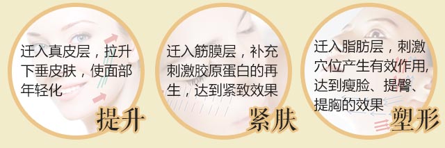 针对面部、乳房、臀部松弛下垂部位,将可被人体吸收的胶原蛋白线有规律地迁入到皮肤组织不同层次内,替代原来因衰老而坍塌的胶原网架,一收、一紧、一提、一拉,刺激体内胶原蛋白生长,深层提拉肌肤,达到提升、塑形、紧肤的效果。